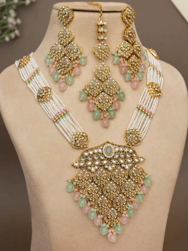 Selecting the perfect wedding necklace set involves considering the neckline of your dress, your personal style, and how the pieces will complement your overall look .Add some beauty to your jewellery collection with these gold plated meenakari necklace set .These necklace set will elevate your look on this wedding occasion, sangeet , marriage ,engagement, karwacahuth.