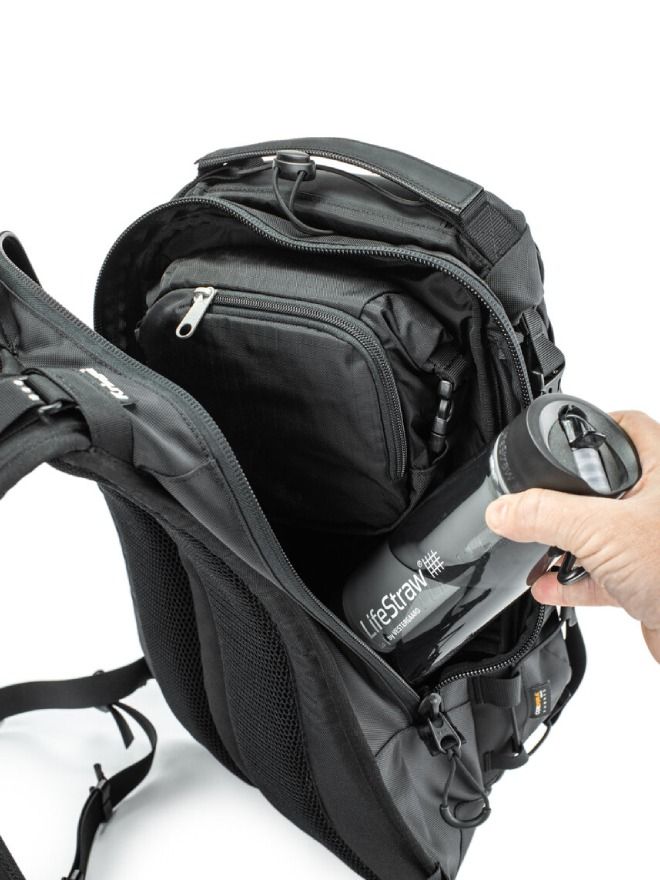 Composed of three sections:  A heavy-duty zip access 7-litre rear compartment which is a perfect storage area for a Tool-Roll and water bottle or the optional 3 Litre Hydration Reservoir. This area also has a small internal waterproof pocket for a phone and wallet, combined with the main roll-top body providing a total of 12-litres 100% waterproof storage. The innovative Hypalon net also provides more external storage for wet gear.